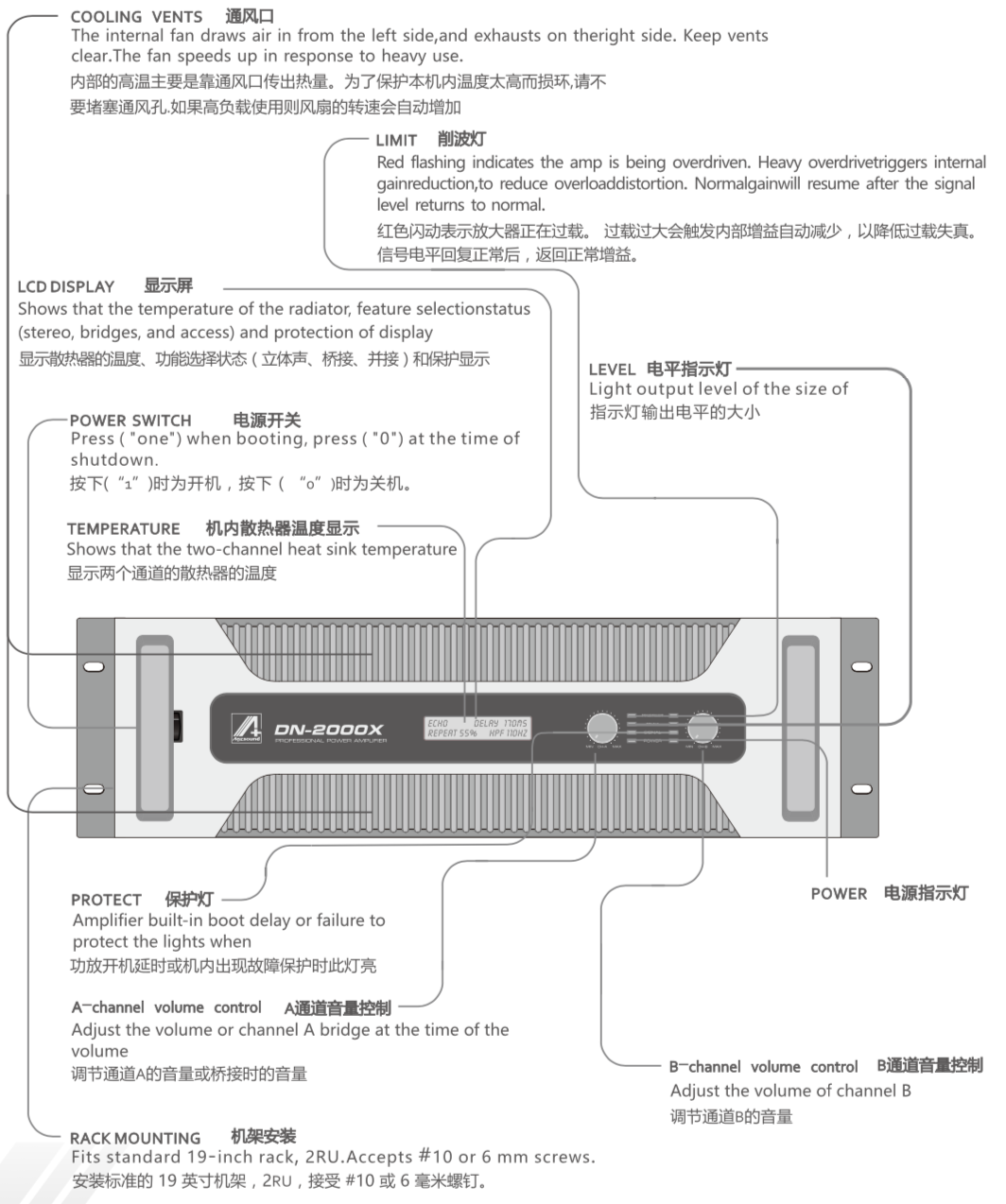 -Agasound DN Series thiết kế 2 kênh, hoạt động với các mạch bảo vệ loa cao cấp, bao gồm ngắn mạch, hở mạch, quá tải, quá nhiệt, bảo vệ cho lỗi DC, v.v., giúp tăng cường âm thanh và hoạt động an toàn bền bỉ, mang lại khả năng bảo vệ mạnh mẽ.Hệ thống tản nhiệt được thiết kế độc đáo giúp cải thiện hiệu quả, hiệu suất tản nhiệt lên đến 40%. Luồng khí làm mát được lọc bởi nắp bụi trước khi đi qua tản nhiệt, giúp tăng cường tản nhiệt và tránh bụi.