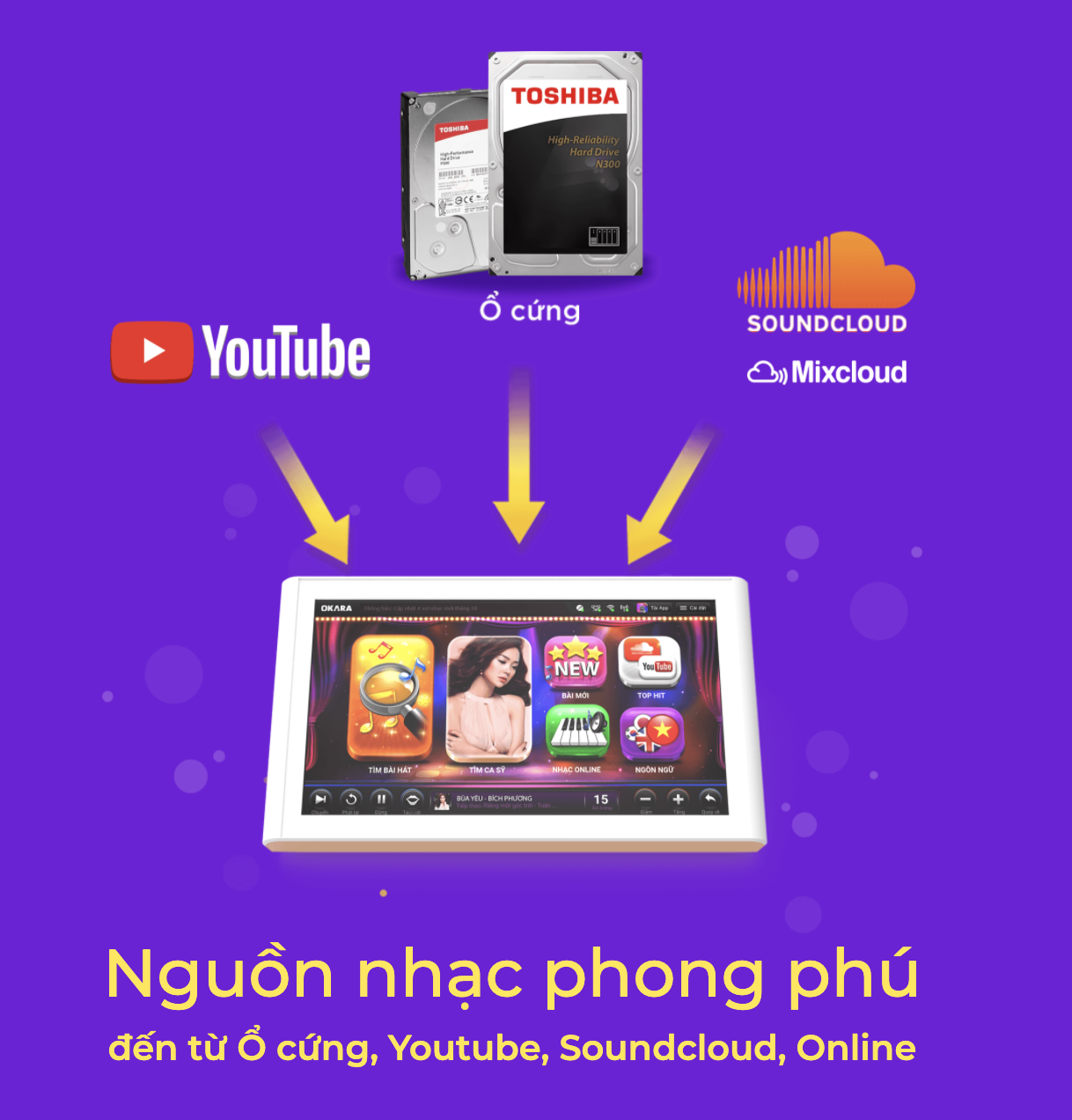 - OKARA H20 là đầu karaoke full HD hỗ trợ tất cả các phương thức cập nhật dữ liệu phổ biến nhất hiện nay như: Ổ cứng gắn ngoài (HDD), USB, cập nhật dữ liệu Online thông qua hệ thống Cloud Server.