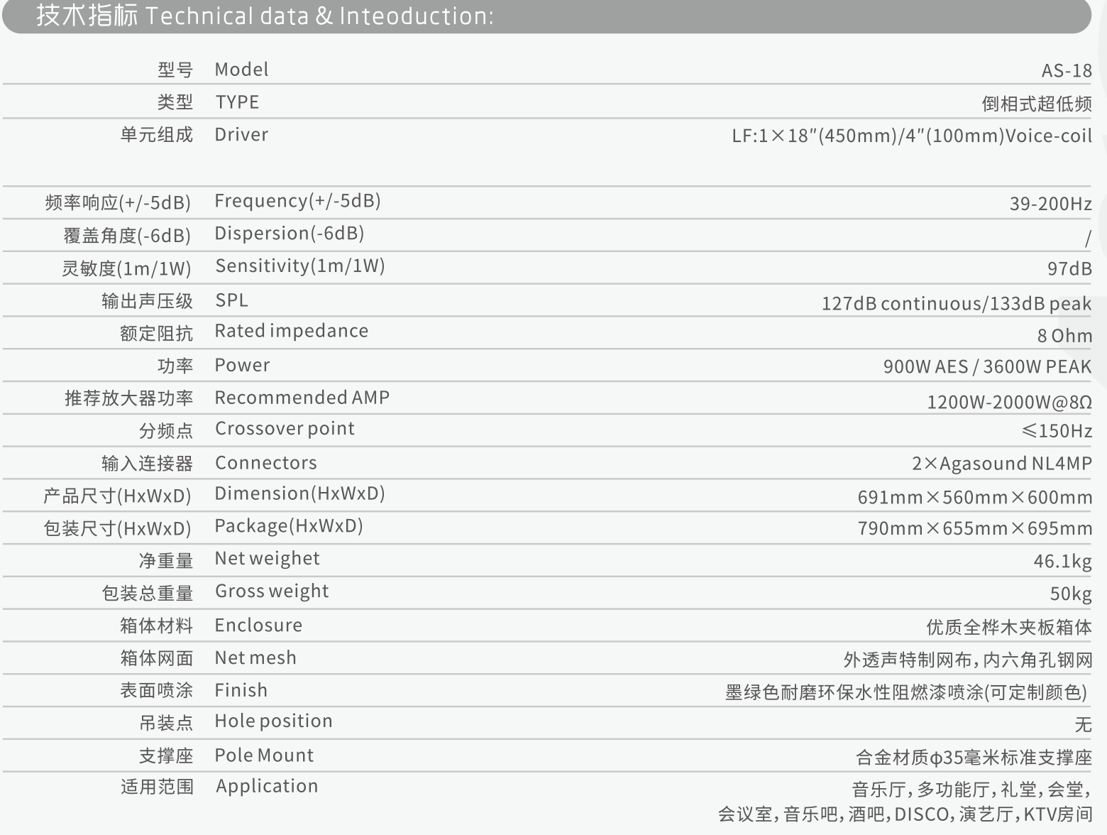 • Driver LF:1×18″(450mm)/4″(100mm)Voice-coil