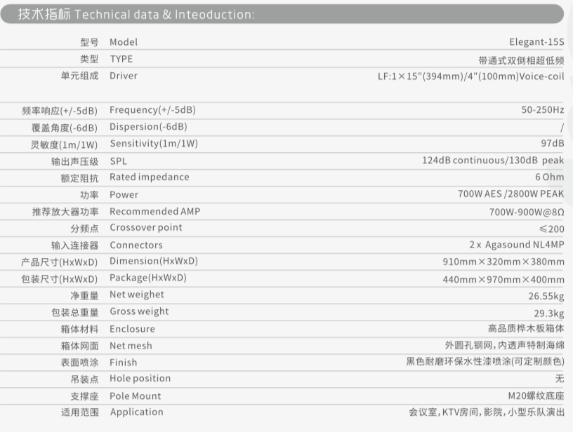 Thuộc series Column Elegant của hãng Agasound, Subwoofer Elegant-15S cho dòng loa column Agasound là thiết bị sub hơi nhỏ gọn nhưng rất mạnh mẽ, được thiết kế cho nhiều hệ thống âm thanh gia đình : xem phim,nghe nhạc , hát karaoke …với thiết kế nhỏ gọn, đẹp mắt, cực kỳ ấn tượng đối với các phòng khách hoặc phòng ngủ gia đình .Tôn thêm vẻ đẹp cho không gian căn phòng của bạn .